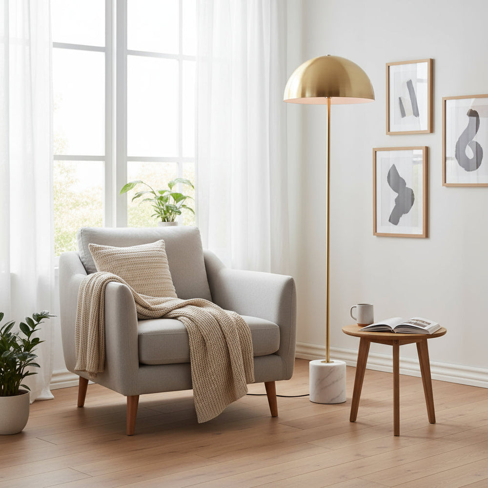Ob ein modernes Wohnzimmer, ein skandinavisch inspiriertes Schlafzimmer oder eine luxuriös gestaltete Leseecke: Die Murdoch-Stehlampe passt. Besonders gut funktioniert sie zusammen mit Naturmaterialien wie Leinen-Kissen oder Holz-Beistelltischen. Auch ein Einsatz von weiteren Messing- oder Marmor-Details im Raum verstärkt den Stil. Ein Tipp: in Kombination mit einem Dimmer lässt sich die Lichtstimmung von funktional bis gemütlich anpassen. Vorasi